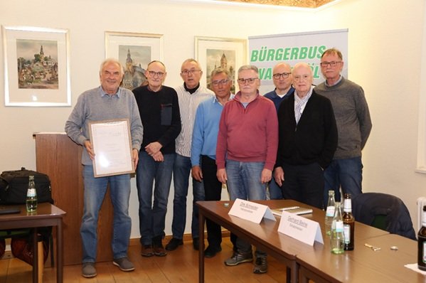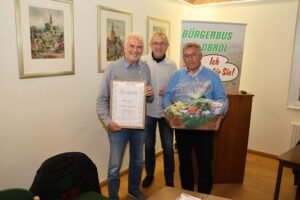 In seiner Amtszeit habe Michael Jaeger, hob der neue Vorsitzende in seiner Dankesrede hervor, große Herausforderungen zu bewältigen gehabt. In erster Linie die Folgen des Markthallenbrandes 2022, als beide Busse Opfer der Flammen wurden und die Waldbröler für kurze Zeit der einzige Bürgerbusverein Deutschlands ohne Busse gewesen waren. Hier für raschen Ersatz gesorgt zu haben, sei in erster Linie sein Verdienst gewesen. Er sei auch der Motor für manche Neuerungen wie die Einkaufslinie oder die Fahrten zum „Kaufhaus für alle“ und die „Oberbergische Tafel“ gewesen. Vor allem aber habe er sich eingesetzt für das seit dem Vorjahr neu eingeführte System des Rufbusses, der mit einer App oder per Telefon einfach zu einer der 300 Haltestellen bestellt werden kann. „Im Interesse des Vereins und der Bürgerinnen und Bürger von Waldbröl hast du das alles geschafft. Was hätten wir ohne dich gemacht?“ Er überraschte Jaeger mit einer Urkunde, die ihn zum Ehrenvorsitzenden des Vereins machte. Der sicherte weiteres Engagement im Verein zu und bedankte sich bei seinem Vorstandsteam für die tolle Unterstützung.
